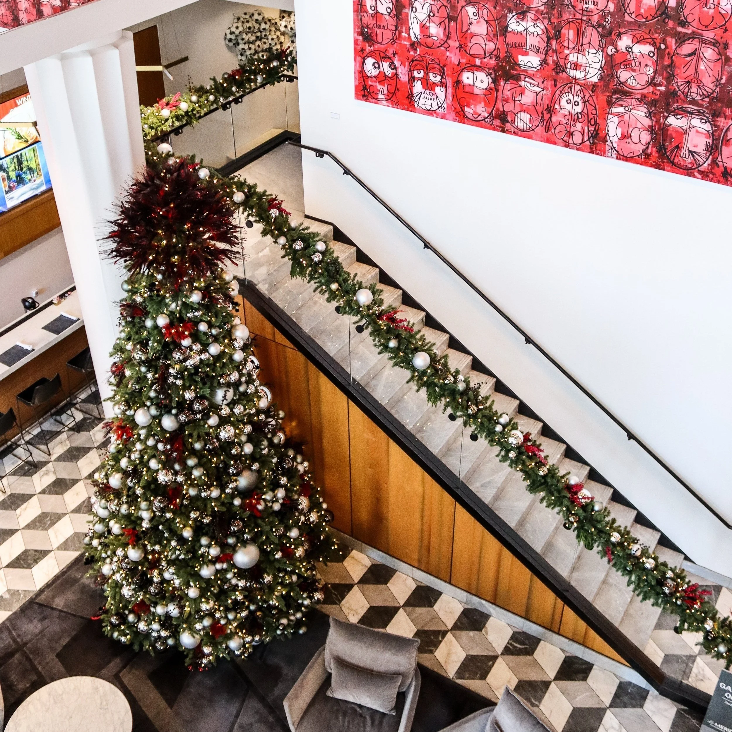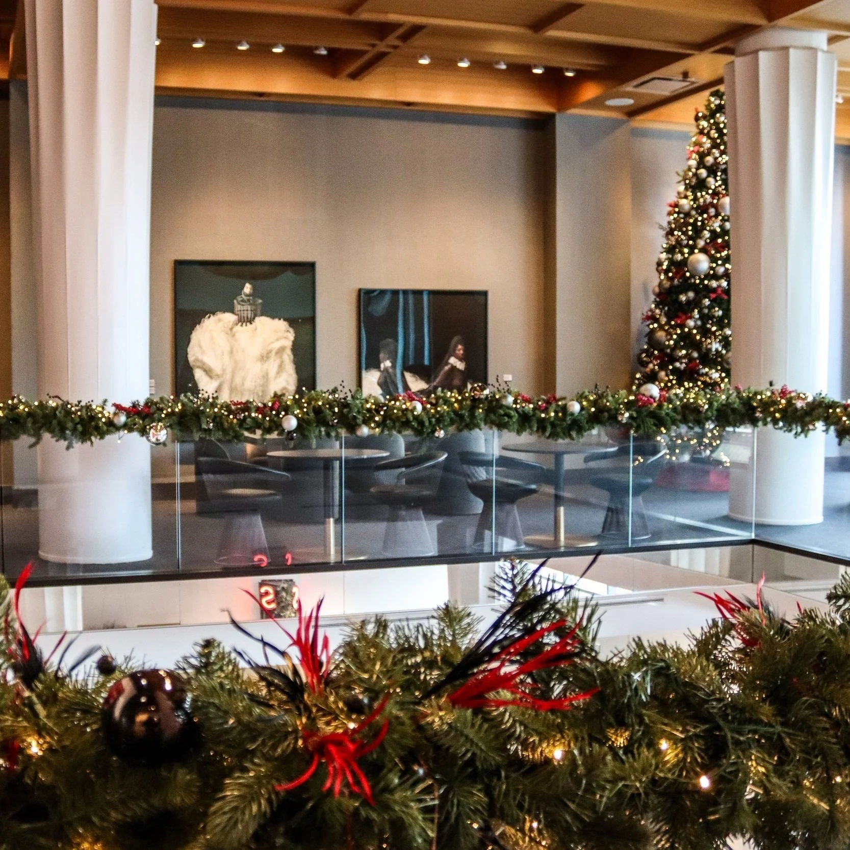 Delight in the ambiance of the season with twinkling lights, lush greenery, and grand holiday trees adorning the property. Guests are welcomed by a soaring centerpiece tree in the hotel lobby, setting a festive tone from the moment they arrive. They begin the celebration in the Atrium Gallery, showcasing rotating works from the Pizzuti Collection, before transitioning into the Michael B Coleman ballroom with its contemporary design and sweeping views of the sparkling Short North High Street Arches.